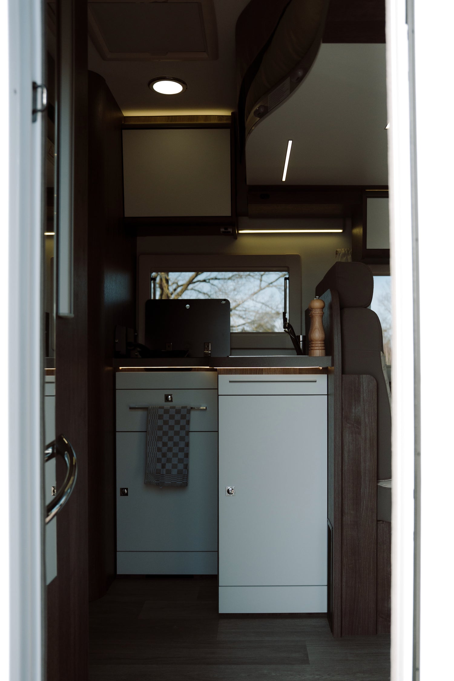 De keuken is praktisch ingericht en voorzien van voldoende werk- en bergruimte. Met het gasfornuis, de spoelbak en de koelkast heb je alles bij de hand om onderweg te koken. Slimme kastjes maken het geheel overzichtelijk.
